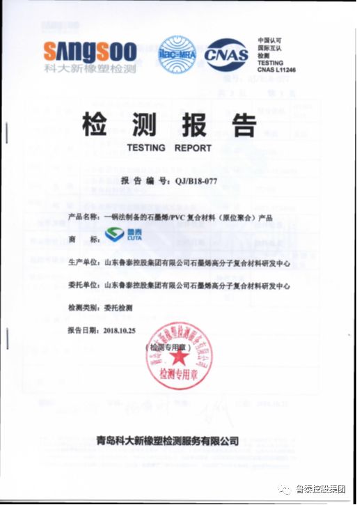 近日,研发中心一锅法制备石墨烯/PVC复合材料原位聚合产品性能检测通过CNAS(中国合格评定国家认可委员会China National Accreditation Service for Conformity Assessment)认证。 这意味着集团公司石墨烯/PVC复合材料原位聚合产品性能得到了权威认可,赢得了社会各界信任,为产品全面推向市场奠定了基础。
